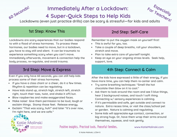 A mom friend got caught in a lockdown at her child's school recently, and she posted about her frightening experience on Facebook. Another friend asked if anyone helped the kids re-regulate their nervous systems when it was over. Unfortunately, the answer was no--kids were just released to go on to the next thing, probably still scared and with adrenaline [...]